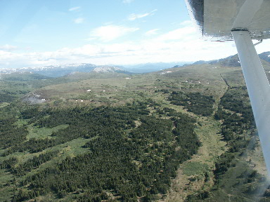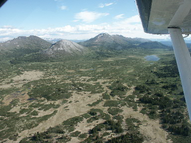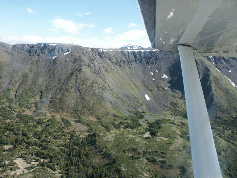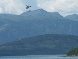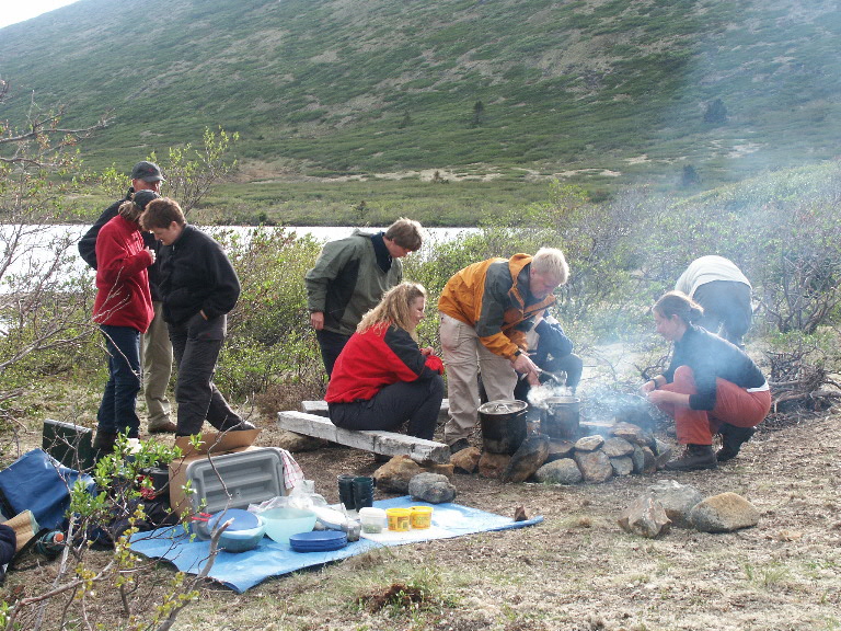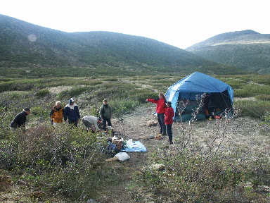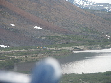 Uiteindelijk vliegen we op Fire Lake af. Op de rechter foto is te zien dat er al enkele tenten staan, de eerste helft van de groep had hun tenten al opgezet en was al begonnen aan de grote muskieten tent. Al snel kwam er bewolking en werd het ook wat kouder.