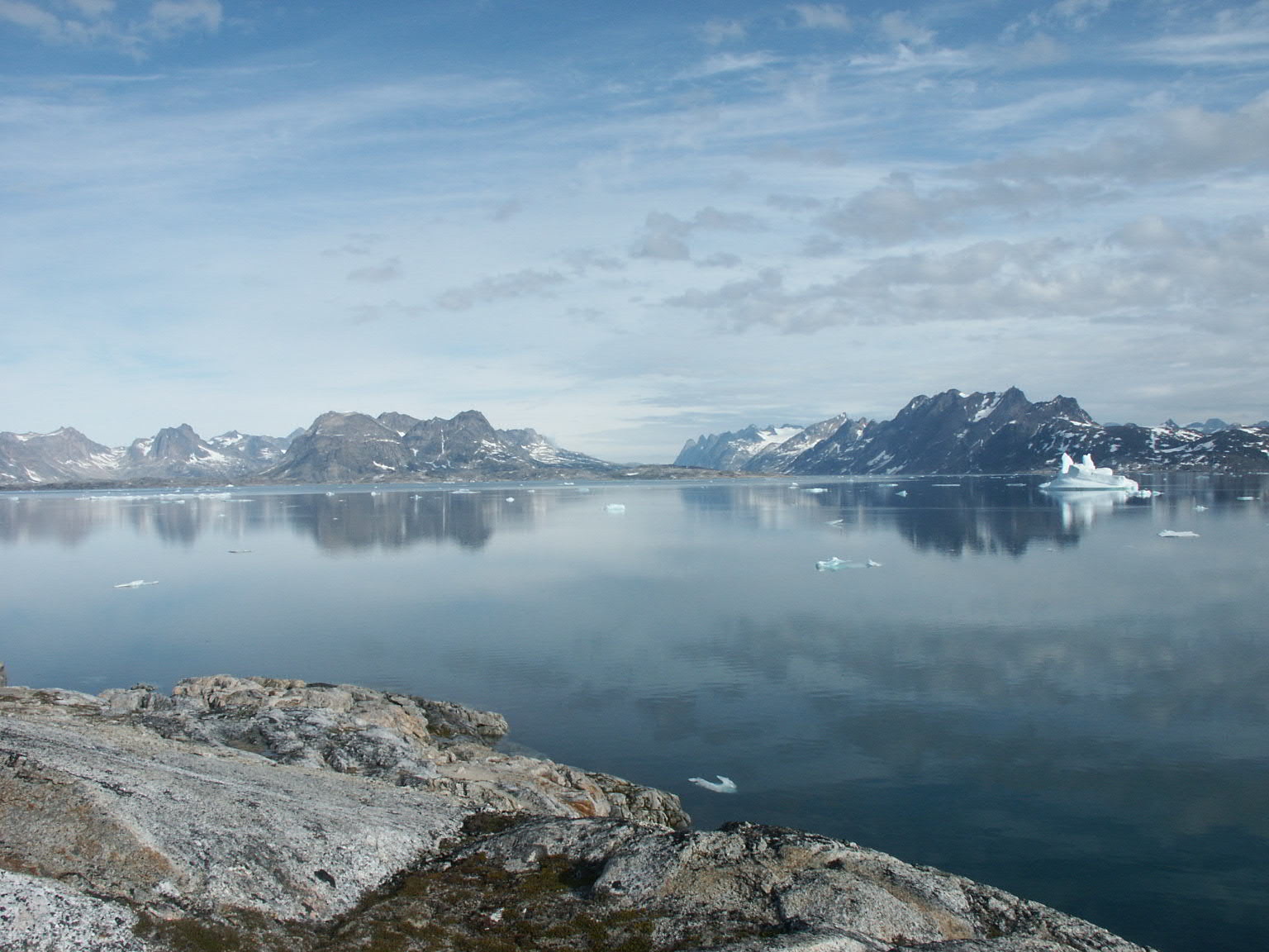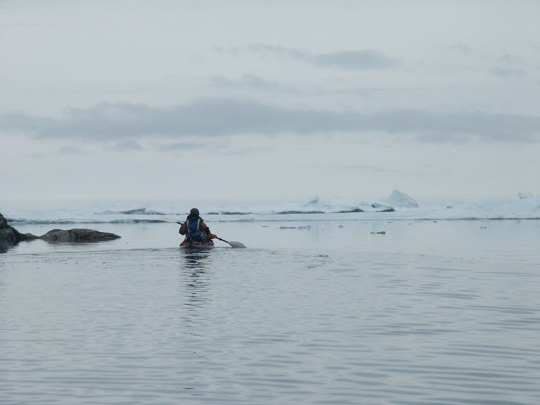 Als we wakker worden is het best aardig weer en hebben we een schitterend uitzicht op het Angmagssalik Fjord. Vandaag staat al weer de tocht terug naar Kulusuk op het programma. Het is in beginsel de langste tocht, dus we vertrekken op tijd. Langzaam trek het dicht en op het laatst regent het bij een koude wind en een temperatuur die daalt tot 3 graden boven nul. De gevoelstemperatuur zit daar ver onder. Het blijkt dat met name mijn kleding eigenlijk net tekort schiet. Voor Angelique hebben we dikke, waterdichte handschoenen gekocht, en ze zit sowieso wat ruimer in de warme kleding. Het had niet veel langer moeten duren, dan had ik echt last van me handen gekregen. De wind heeft overigens nog iets anders gedaan, namelijk ijsschotsen van zee het fjord in blazen. In een kajak zit je laag op het water, het is moeilijk om overzicht te houden. Een keer moeten we echt een stukje terug. Als af en toe passerende Inuit vanuit hun motorboten niet hadden gewaarschuwd, hadden we vermoedelijk veel meer terug moeten varen. Maar het is wel heel speciaal, zo tussen het ijs te kajakken. |