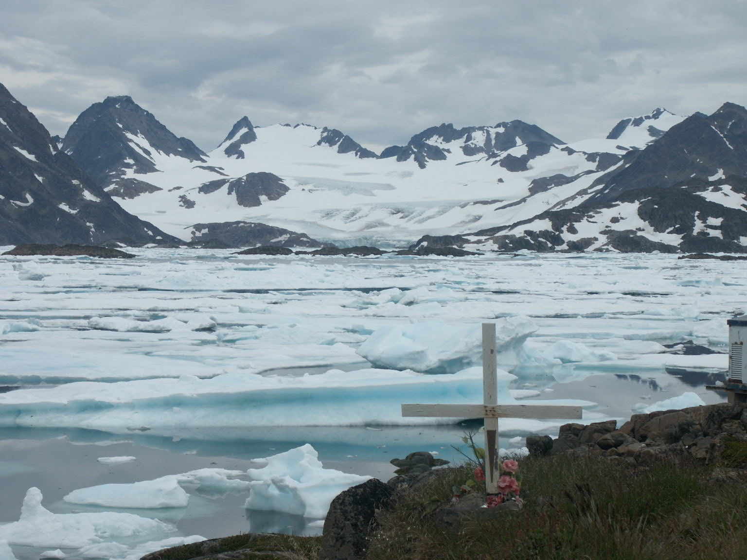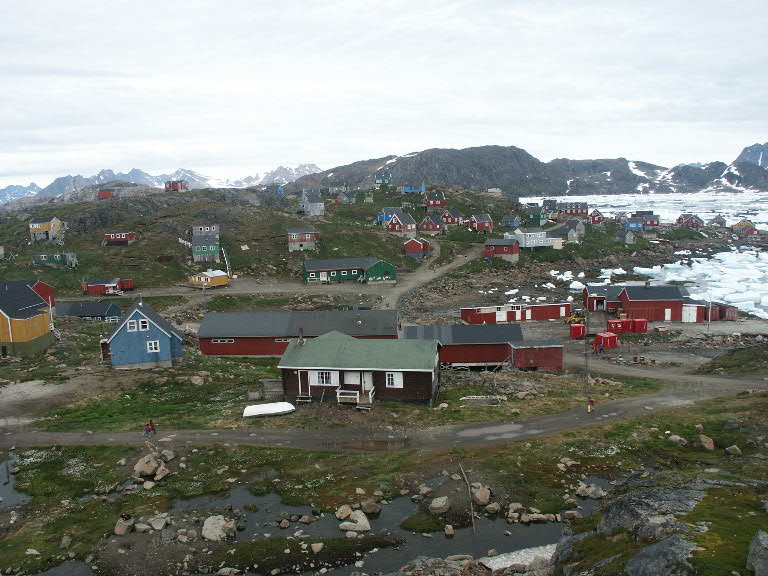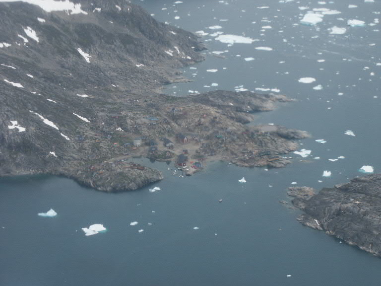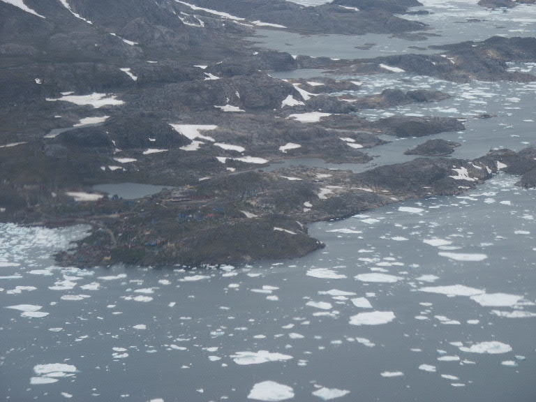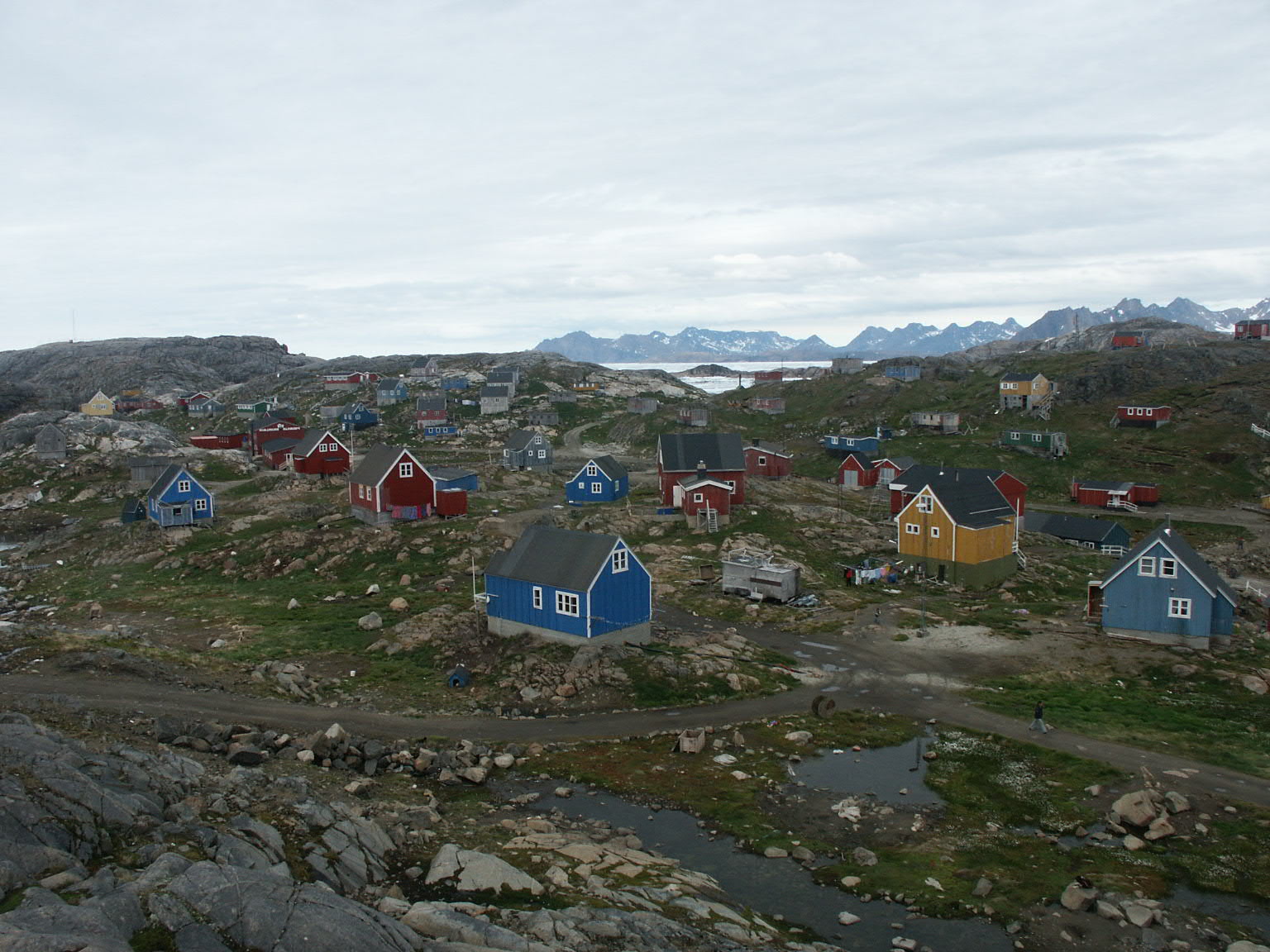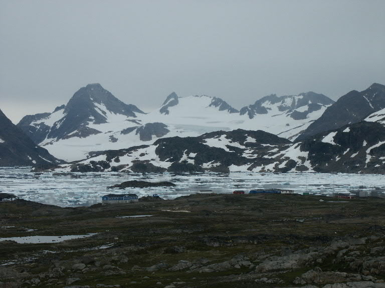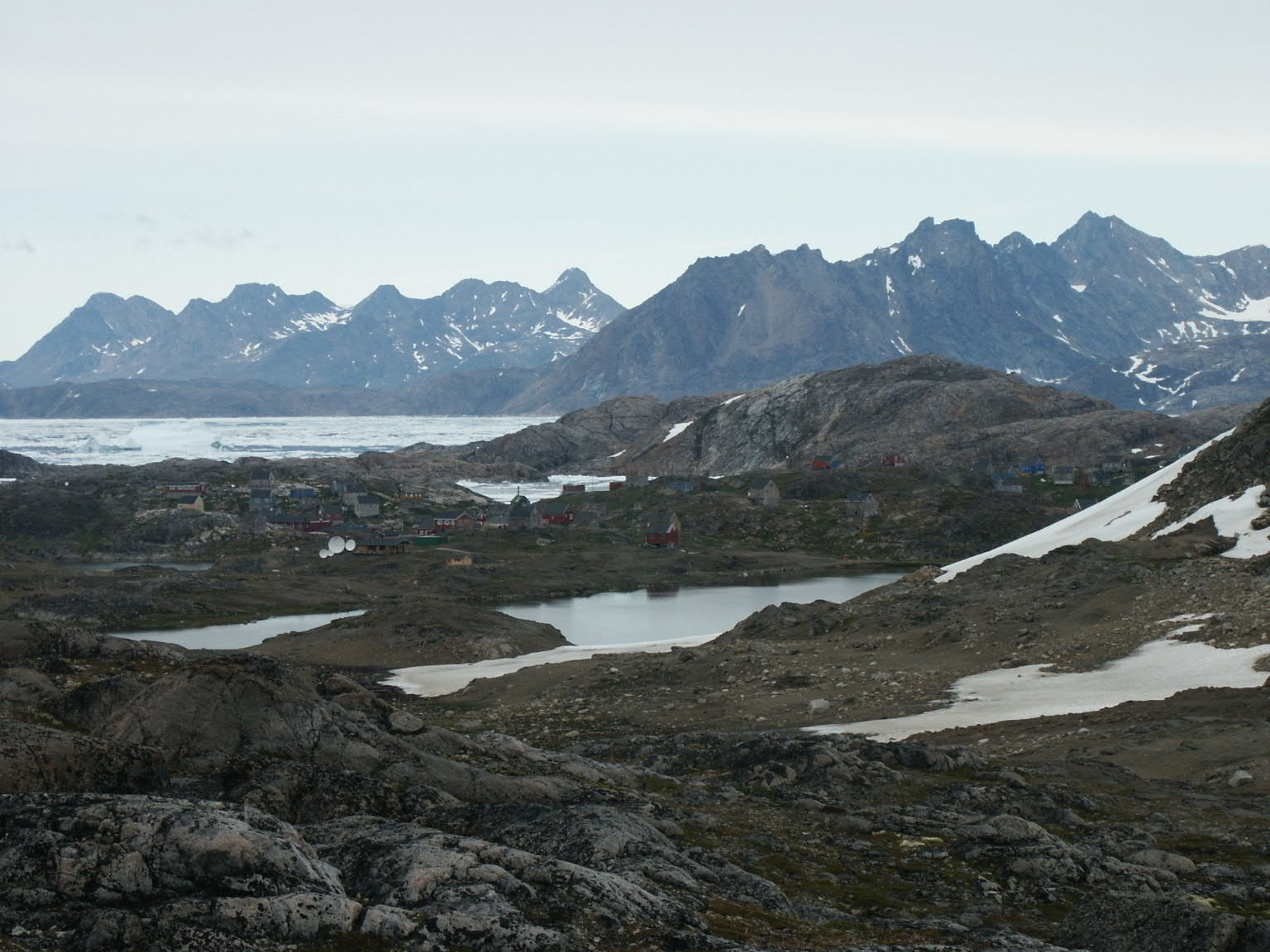 Kulusuk. Het water in de verte is helemaal bedekt met pakijs.
