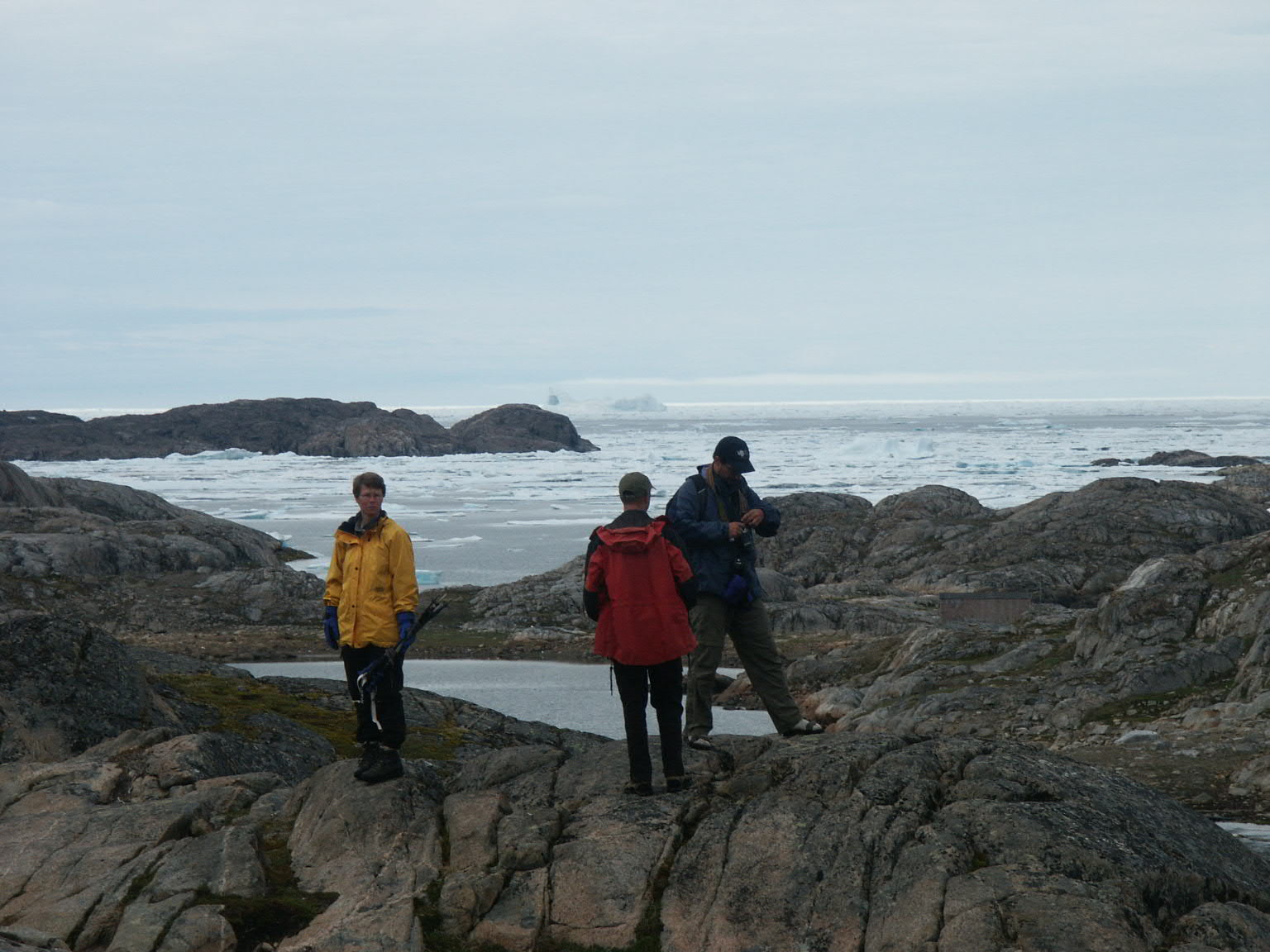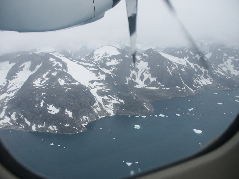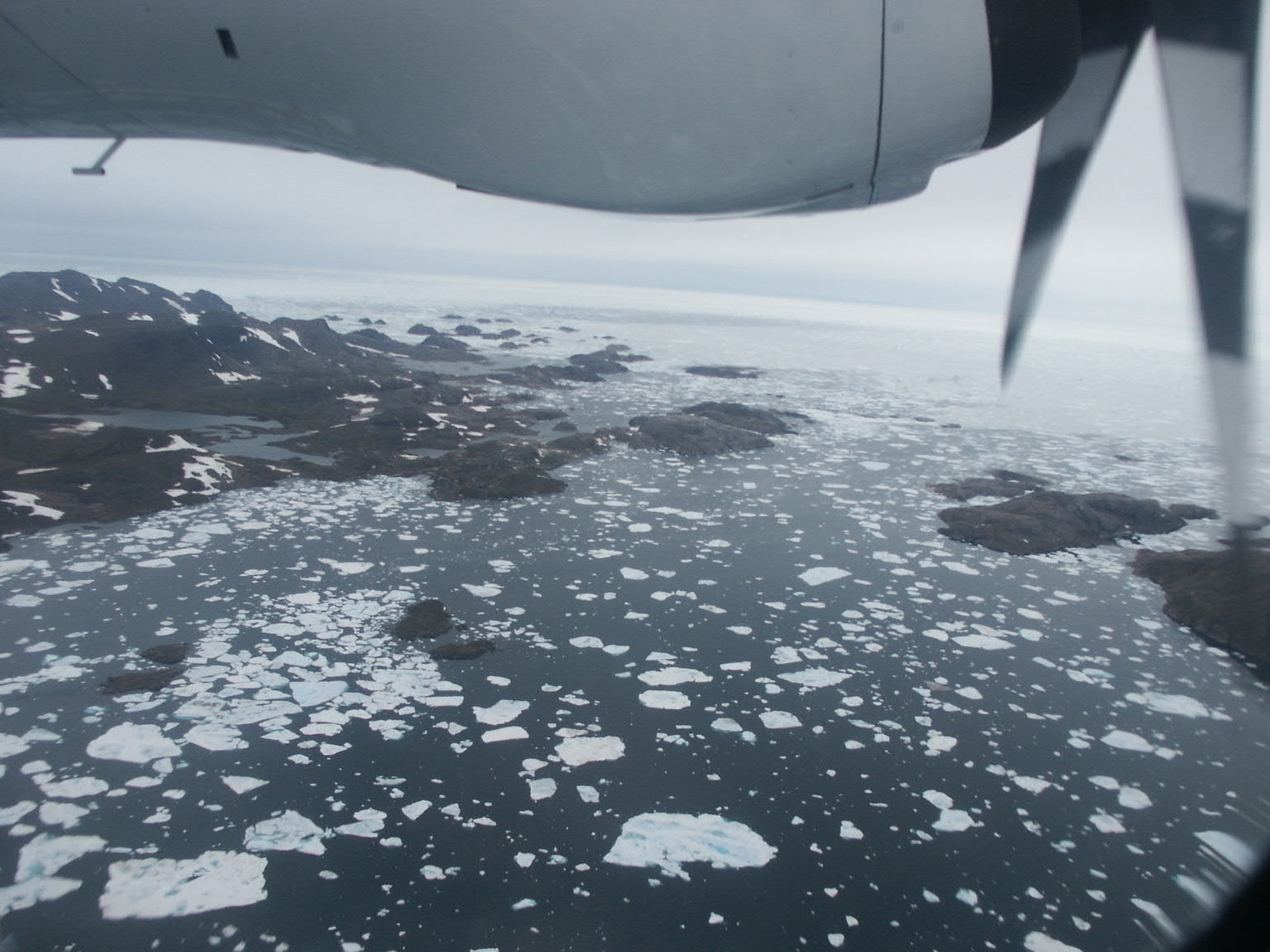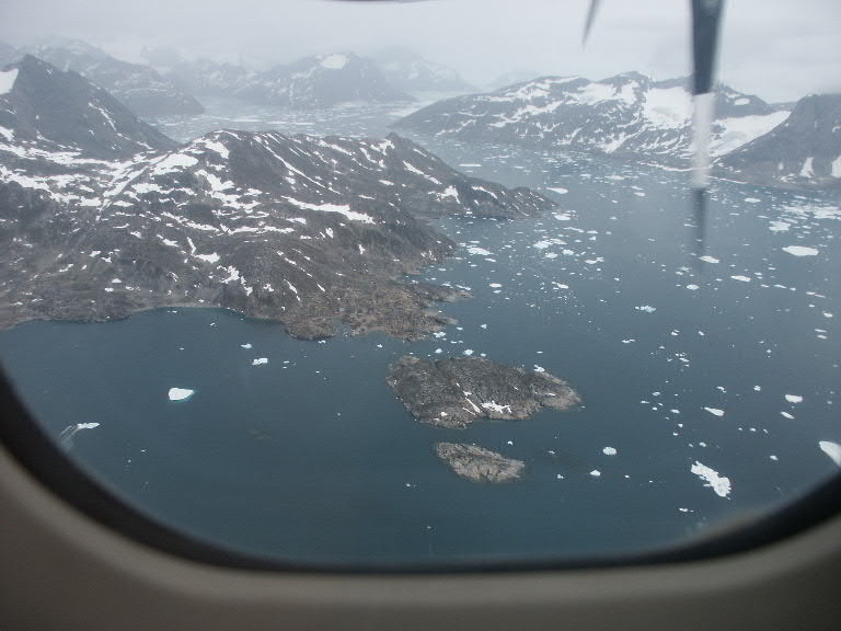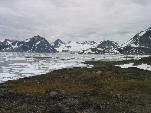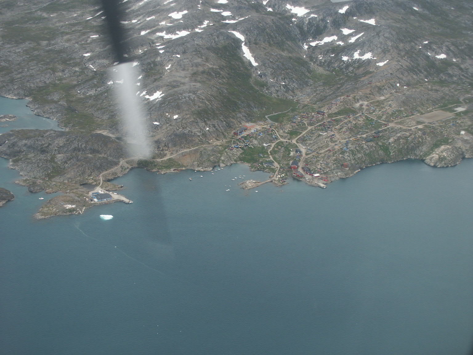Kulusuk. Het water in de verte is helemaal bedekt met pakijs.