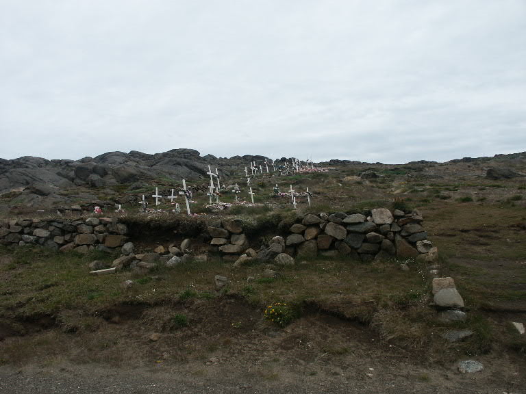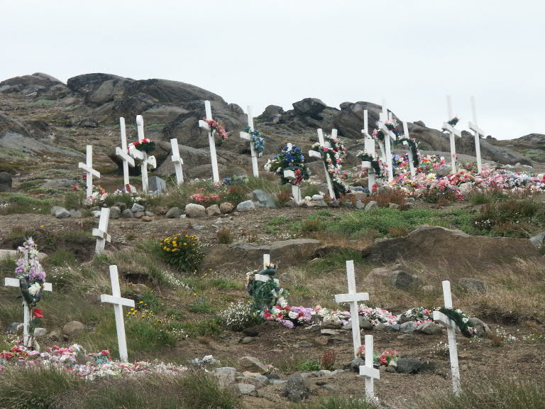 Een los graf, buiten de begraafplaats, met ijsschotsen op de achtergrond.