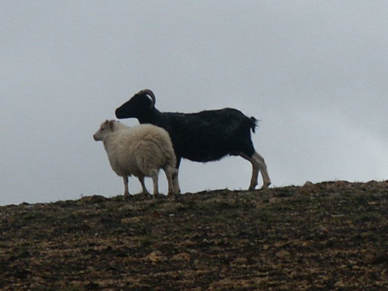 In de verte staan een zwart en een wit schaap, naast elkaar. Zou het een symbool zijn? Het lijkt wel zo bedoeld.